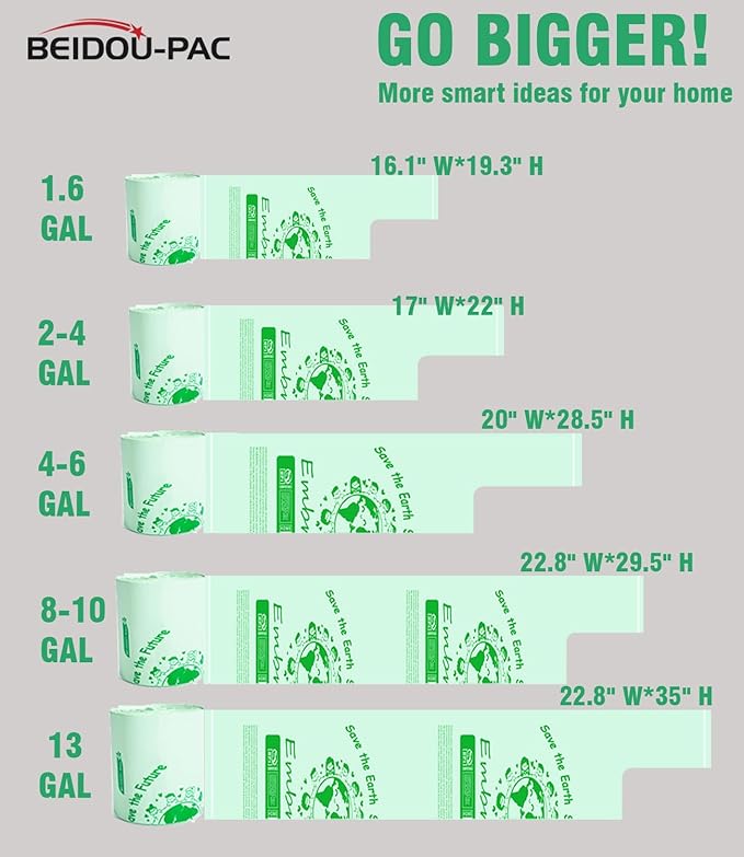 - [MORE RESPONSIBLE CHOICE] -- it has never been easier to do your part and contribute to a better environment with BEIDOU-PAC compostable garbage bags. Biodegradable bags wastebasket liners are perfect for kitchen waste, table food scrap, daily trash and outdoor dinner parties or office, home, bathroom, bedroom, car, dog Pet. We are all responsible for saving the earth and feel less guilty anymore. It's an excellent replacement for plastic trash bags!
