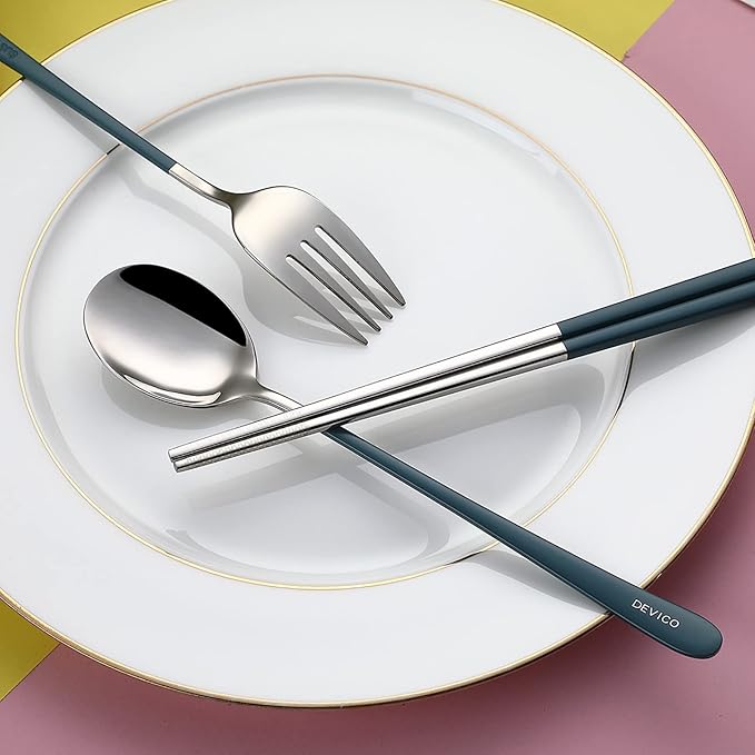 DEVICO Portable Utensils, Travel Reusable Silverware Flatware Set for Lunch, 18/8 Stainless Steel 4-Piece Camping Cutlery Include Fork Spoon Chopsticks with Case (Blue)