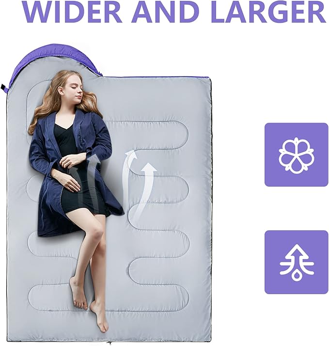 - 【COMBINATION& DETACH】: The left zipper can pull the ordinary sleeping bag and the right zipper wide bag together to form a double bed; We use a two-way zipper with a "zipper guard". For this design, you can easily and quickly pull yourself into a warm sleeping bag. The double zipper slider allows you to open the bottom of the sleeping bag on warm nights and also closes while lying inside. You can even open the sleeping bag completely and use it as a blanket.