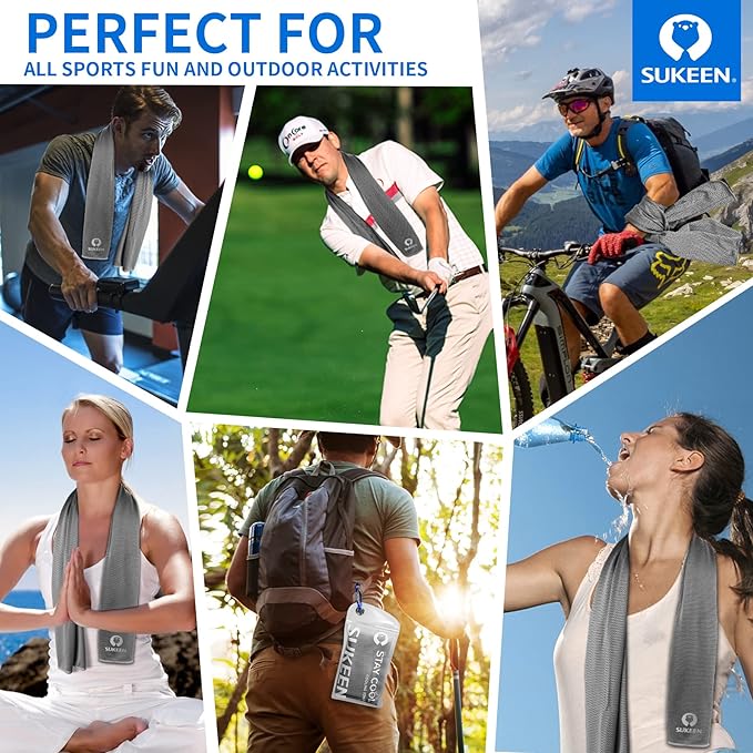 - INSTANT COOLING & REUSABLE: Cooling towels are very easy to use and activate, simply soak it, wring it, snap it and wrap it, to reactivate, simply rinse and repeat the process, then you can reuse it so many time. Sukeen cooling towels is machine washable, and won't fade over time.