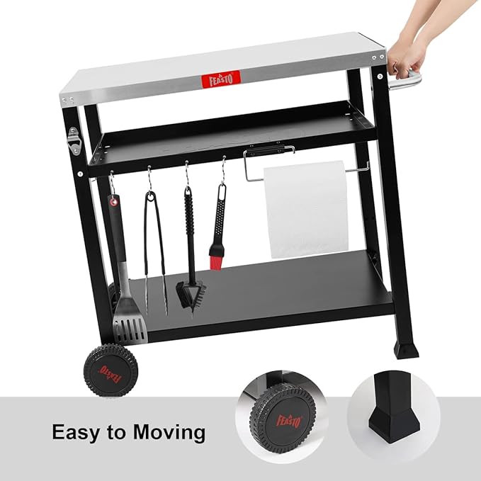 - Sturdy Structure: This grill table for outside has 2 big size wheels and 2 horseshoe. And the tabletop and bottom plate can hold 150 lbs and 100 lbs respectively,add the middle plate can bear up to 300lbs in total. It meets all your outdoor cooking needs