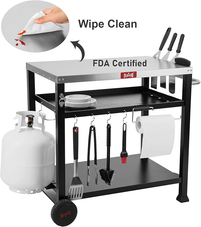 - Large Storage: Place as more tools as you want on this outdoor prep table for grilling. Such as put a pizza oven on the table, and a pizza oven stand is born.There also has 4 S hooks, side extra thin rack and specific tank mounting position hook,etc