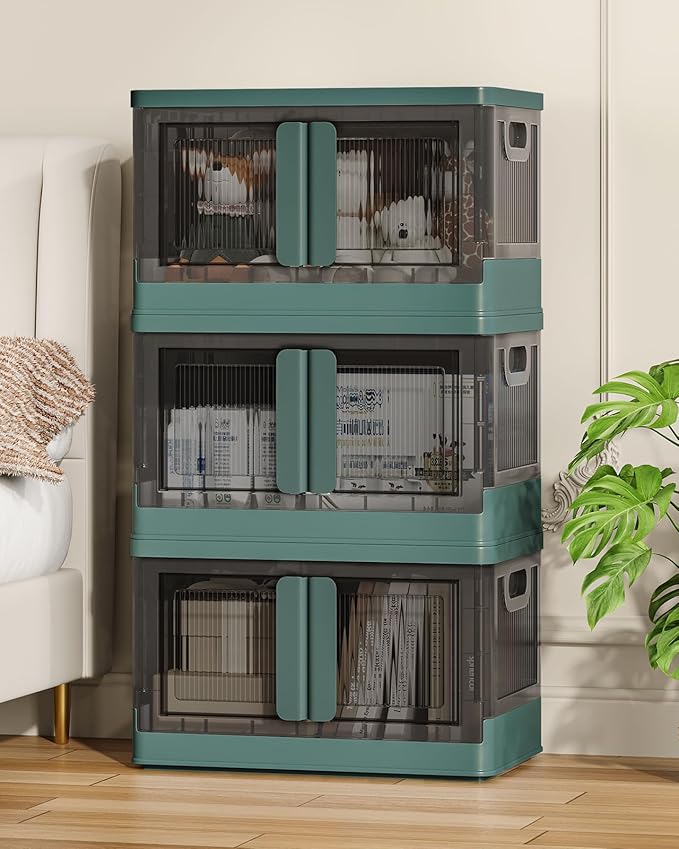 8.4Gal Collapsible Storage Bins with Lids & Wheels - 3 Pack Stackable with Doors, Heavy-Duty Plastic Containers for Home/Office, Green