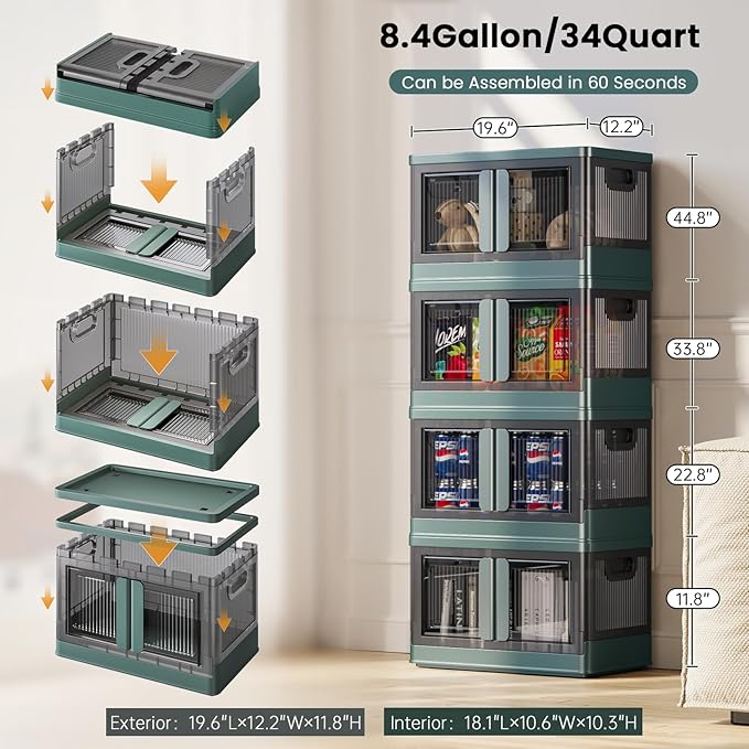 8.4Gal Collapsible Storage Bins with Lids & Wheels - 1 Pack Stackable with Doors, Heavy-Duty Plastic Containers for Home/Office, Green