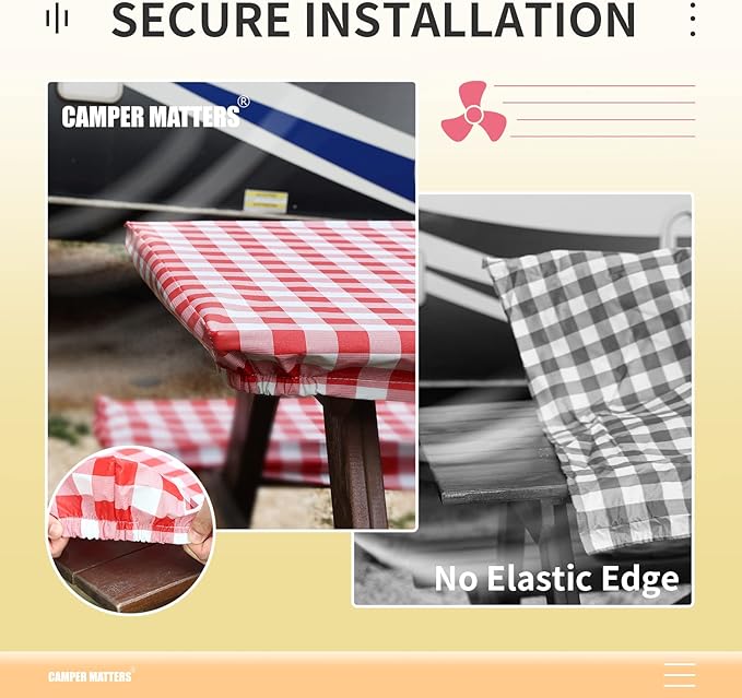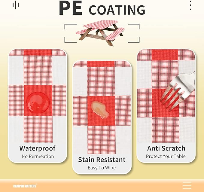 - 【ELASTIC TABLECLOTH AND BENCH COVERS】Classic red & white table and bench covers are perfect for an outdoor picnic. The package includes 72’’ x 28’’ Table cover x 1 and 72’’ x 12’’ bench cover x 2. The elastic edge design wraps the table and bench nicely even wind blowing.