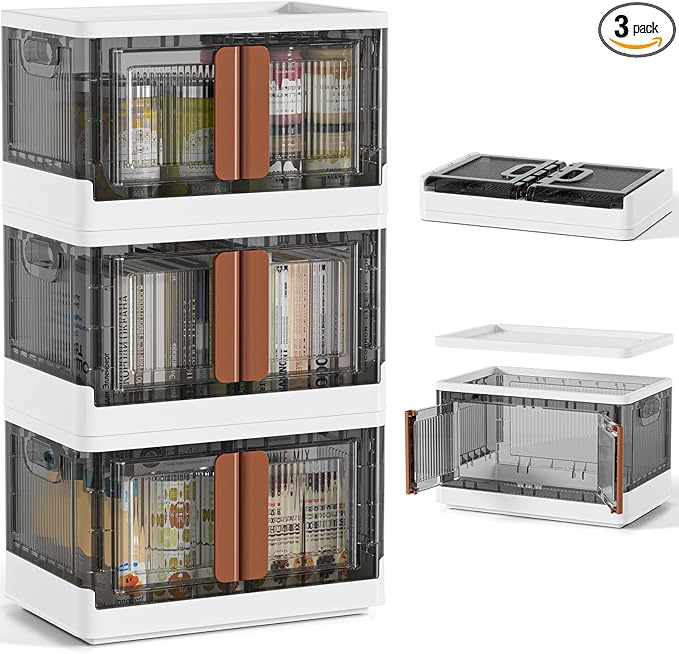 HAIXIN Closet Organizers and Storage - Trunk Car Organizer with Lids and Doors, Dorm Room Essentials, 8.4 Gal Collapsible Stackable Storage Bins, Plastic, 3 Pack