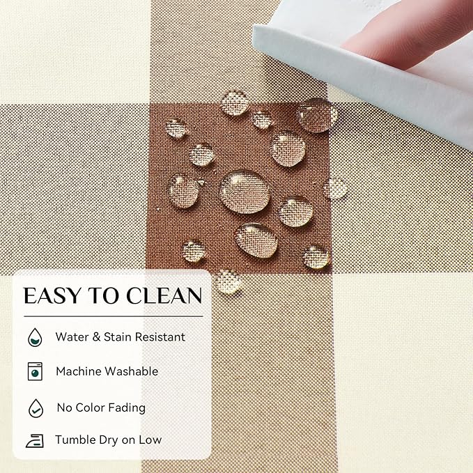 - SPILLPROOF and STAIN RESISTANT: Featuring a fade resistant fabric, the gingham pattern tablecloth is specially treated to be 90% waterproof. Liquids and wine can be easily wiped clean with a damp cloth.