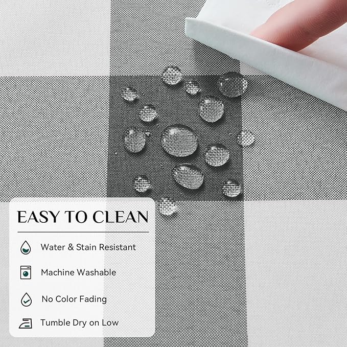 - SPILLPROOF and STAIN RESISTANT: Featuring a fade resistant fabric, the gingham pattern tablecloth is specially treated to be 90% waterproof. Liquids and wine can be easily wiped clean with a damp cloth.