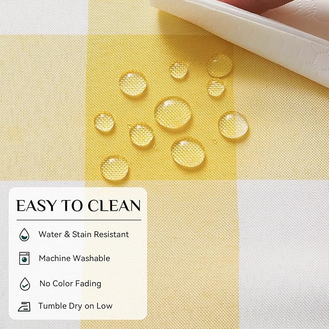 - SPILLPROOF and STAIN RESISTANT: Featuring a fade resistant fabric, the gingham pattern tablecloth is specially treated to be 90% waterproof. Liquids and wine can be easily wiped clean with a damp cloth.