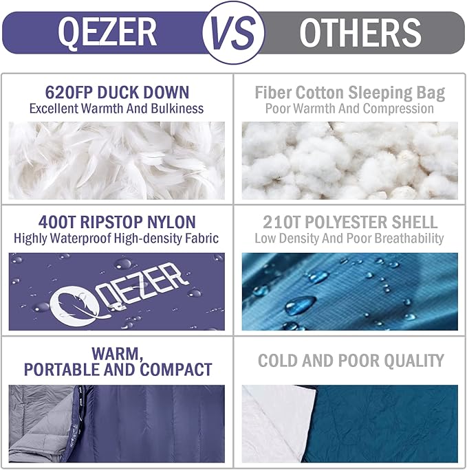 - 【 𝐒𝐀𝐓𝐈𝐒𝐅𝐀𝐂𝐓𝐈𝐎𝐍 𝐆𝐔𝐀𝐑𝐀𝐍𝐓𝐄𝐄 】QEZER always provides our customers with the best sleeping bag products and services with stylish design, premium down and more perfect outdoor functions. If you have any product questions, please contact us via Amazon and provide your order number, we will respond sincerely and do our best to keep you satisfied.