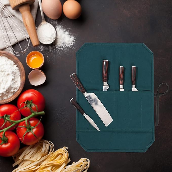 Kaaltisy Chef Knife Roll Bag, Heavy Duty 16oz Waxed Canvas Knife Storage Case, Knife Carrier Roll with Cut Resistant Fabric, 5 Slots Knife Bag with Tie Rope - Dark Green