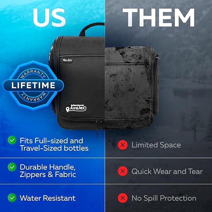 - β VERSATILE TRAVEL BAG FOR TOILETRIES: Compact, lightweight and made of premium polyester with no smell and an easy to clean lining, this large toiletry bag is a keeper! Plus, it will save you the mess of spilled liquids on your clothes in your luggage, thanks to its 100% waterproof inner lining! guaranteed.