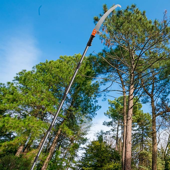 - Wide Application: Two Perfect Uses in One Saw. The saw up to 7.7/10/14 feet in length, can reach higher than a ladder, and it can be hand-held for lower trimming and carding.The pole cutter can be used for tree pruning such as oak palm fronds pines firs and oak and is great for forestry, lawns, gardens, patios, yards, and other areas where need branches and leaves need to be trimmed.