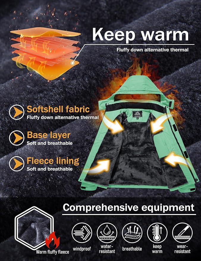 • Water repellent: Professional water repellent jacket, keep your body always dry and comfortable, you won't worry about getting wet while skiing, snowboarding, hunting, hiking in inclement weather.