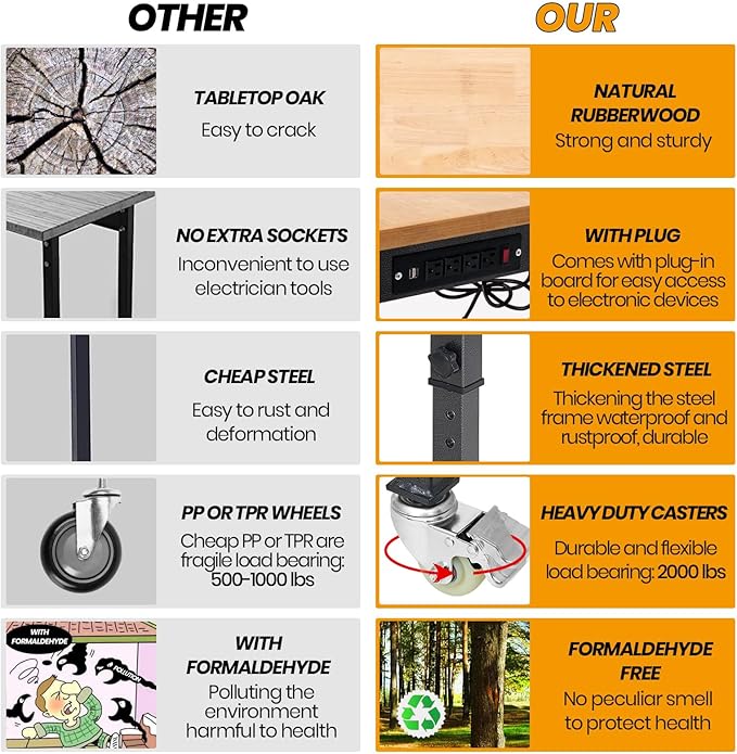 60" Adjustable Work Bench, Rubber Wood Top Workbench Heavy-Duty Work Table with Power Outlet with Wheels, 2000 LBS Load Capacity Hardwood Work Benches for Garage, Workshop, Home, Office, Easy Assembly