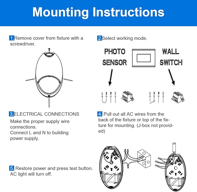 - ๐ใPhotocell & Wall Switch Operationใ--When the power supply system is powered off, the lamp will start the emergency system to turn on the light, and the duration can be up to 90 minutes. The lamp has a light-sensing recognition function. When the light is The 3FC light turns off automatically.Or can be switched through an external switch (not include).