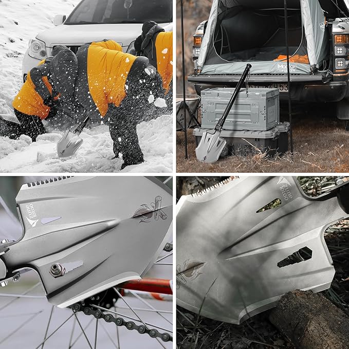 - ๐Camping shovel folding multitool:๐ The compact collapsible shovel surface is designed with saw, scale, wrench, chopper. The handle includes bottle opener, screwdriver, fire starter, whistle, mini hammer, compass.