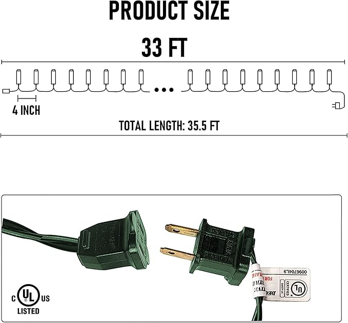 - Light Specifications: With 100 LED lights, each Christmas string lights is 35.5 ft long in total, wire with LED bulbs is 33 ft, lead wire without lights is 2.5 ft, spacing between each LED bulb is 4 inch. Waterproof design allows it to be used indoors and outdoors.