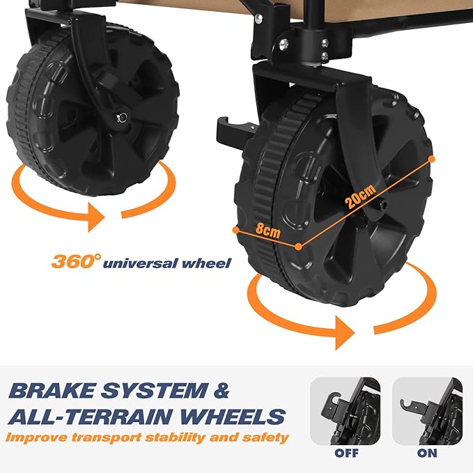- All-Terrain Wheels with Brake System: Can be used on all kinds of rough terrain like sand, mud, mountains, etc. Due to the oversized wheels,which made of a strict rubber material to improve transport stability and the ability to handle rough terrain. It also adds stability,when the van is fully loaded and can be pushed over uneven ground with ease.The handle connects directly to the axle, giving you superior control.We've added a built in braking system to keep the wagon securely by your side.