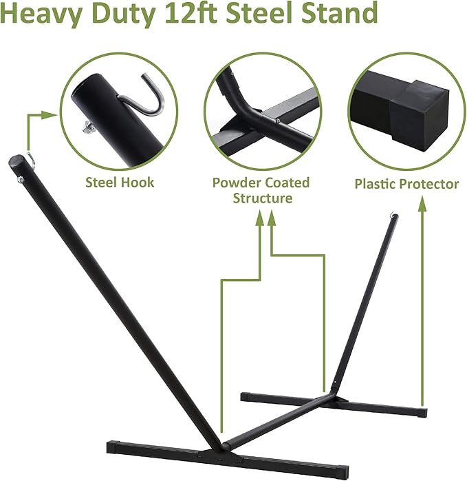 - Freestanding Hammock with Portable Stand: No damage to trees. Created to be stable and long-lasting, the 12 ft stand is made from powder-coated heavy gauge steel. It can be easily assembled in minutes without any tools, and it could be disassembled easily, making it to be a portable hammock. Feel free to contact us if you have any questions during use within one year of purchase. We are always here to help