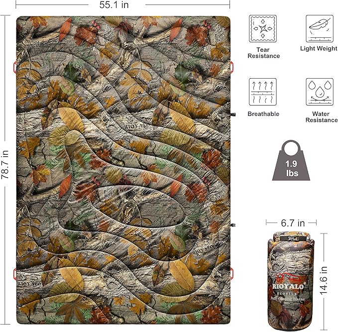 ECOSILK Outdoor Blanket Waterproof | XL Puffy Camping Blanket for Hiking Backpacking | Lightweight Packable Travel Cars Blanket w. Stuff Sack for Picnic Festival |55 X 79 in| Forest Camoโฆ