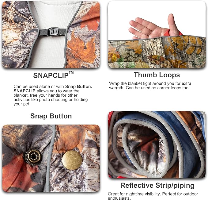 - ๐ฏ WEARABLE LIKE PONCHO LINER ๐ฏ The distinguished SNAPCLIP allows you to wear the blanket like a woobie, free your hands for other activities like photo shooting, preparing food, holding your pet while staying warm. The Snap Button is a surplus and more convenient.