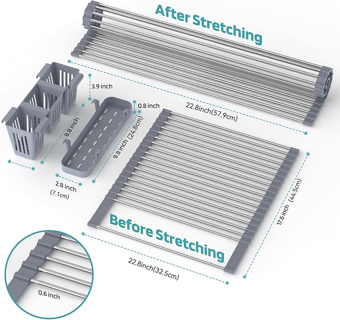 - 【PACKAGE INCLUDES】1pc Expandable Roll Up Dish Drying Rack , 1pcs Utensil basket. we provides 12 months Quality warranty to our customers. For any issue, please get in touch with us.