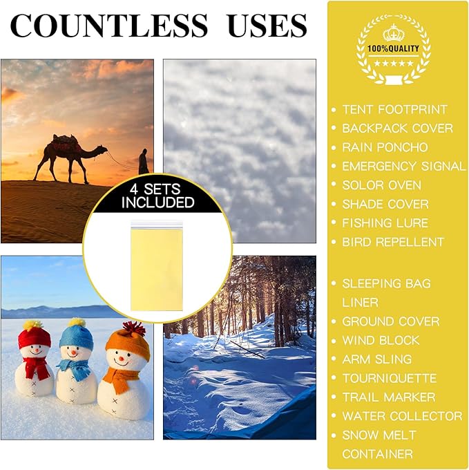 - Package Includes: there are 100 pack of space insulation blankets survival kit camping blankets; Each survival blanket is individually folded, wrapped and sealed for easy storage and retrieval; They are reusable, waterproof, windproof and can also be applied for ground coverings and shading