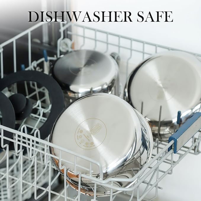 - TRI-PLY CLAD METAL CONSTRUCTION: The stainless cookware is a 3-ply design layering 430 stainless steel, aluminum, and 18/10(304) stainless steel. This layering helps to seal in the aluminum – so you don’t need to worry about leaching – while harnessing aluminum’s better heat conductivity to produce a more homogenous cooking surface.