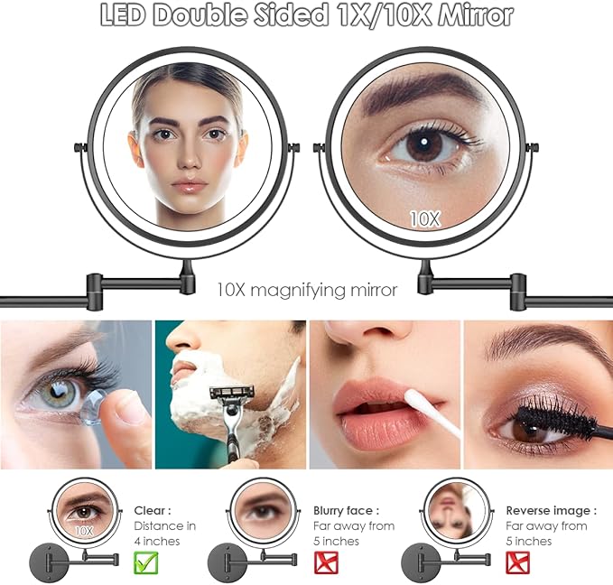 - 【8 Inch Double Sided Wall Mounted Mirror】This upgraded lighted magnified mirror is 8 inch large size and double sided with 1X/10X magnification. The high definition 1X lighted mirror for your overall facial makeup. You can change for the 10X magnifying beauty mirror on the back to show details of your face when putting eyeliner, eyebrows,or lipstick, it’s perfect for delicate makeup. Please keep 4 inch distance when use the lighted 10x magnifying mirror to avoid dizzy.