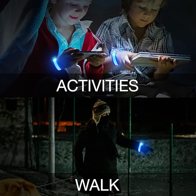 - 【Multi-Usages】:Nicely visible while walking, riding, running, or on a motorcycle at night. Secure enough that you don't have to worry about it flying off at higher rates of speed. Also perfect for dog collar when night walking. Great party supplies. Enough for you to share with your families and friends. Kids always love this light up bracelets. Age grading: 3 + years old