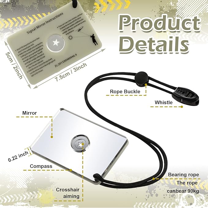 - 4 in 1 Functions: our signal mirror contains a total of 4 functions, signal mirror survival, whistle, compass, load bearing rope; The mini compass is easy to read and confirm the direction, allowing you to be more precise when looking for directions, and the lanyard allows the compass to be hung on the zipper of the backpack or hung on the key ring for easy carrying