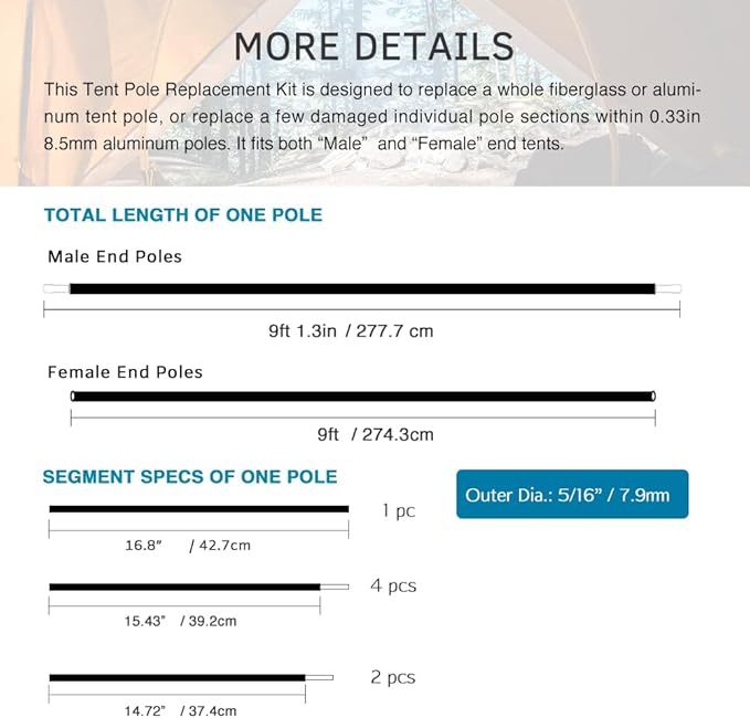 - MALE & FEMALE END POLES - Not all poles are MALE ends. You could assemble our tent pole repair kit to make it either MALE or FEMALE.