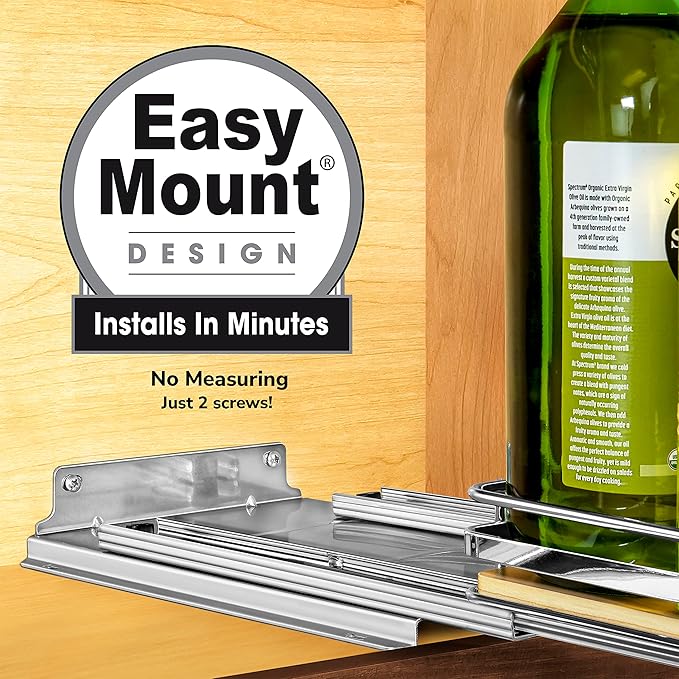 - SETUP IS A BREEZE! – no struggling within limited space trying to place four awkward and difficult to reach screws inside your upper cabinets or into pantry shelves – our exclusive EASY MOUNT cabinet friendly drawer design installs with just two screws in the easily accessible back of your narrow cabinets – in minutes with no measuring!