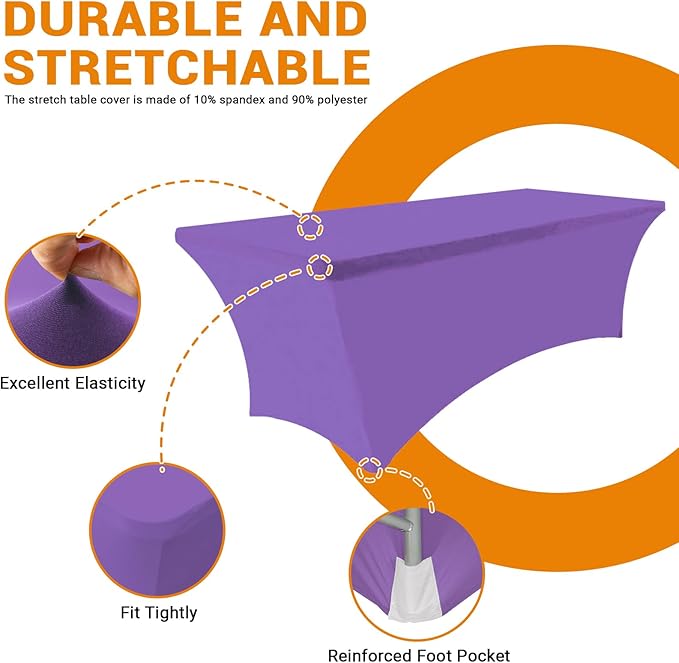 - DURABLE & SPANDEX: The stretch spandex rectangular table cover was made from 10% Spandex, 90% Polyester material, wrinkle and stain resistant stretch spandex fabric with a 200 GSM, which make tablecloth more stretchable and durable, does not require ironing and can be laundered countless times.