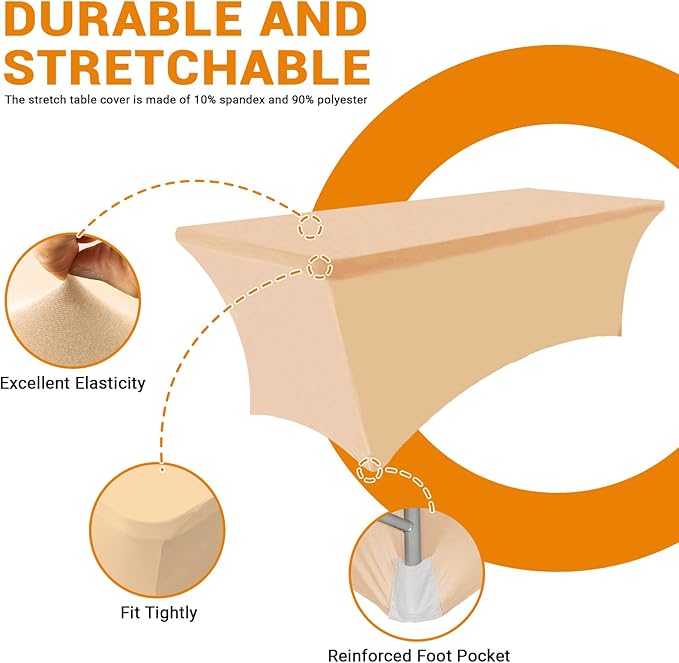 - DURABLE & SPANDEX: The stretch spandex rectangular table cover was made from 10% Spandex, 90% Polyester material, wrinkle and stain resistant stretch spandex fabric with a 200 GSM, which make tablecloth more stretchable and durable, does not require ironing and can be laundered countless times.