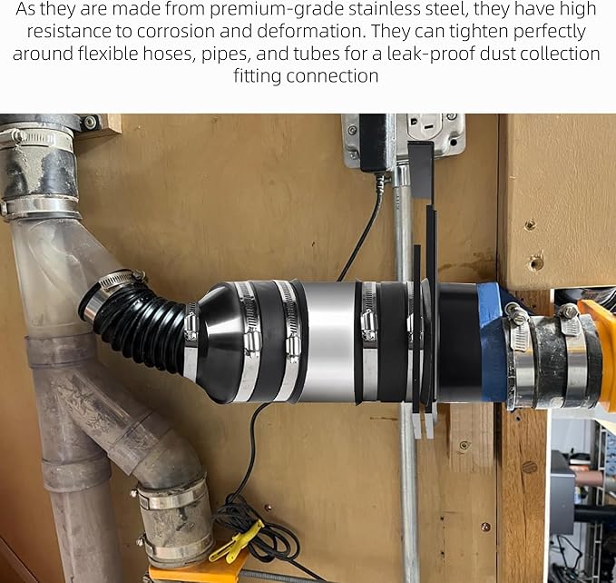- As they are made from premium-grade stainless steel, they have high resistance to corrosion and deformation. They can tighten perfectly around flexible hoses, pipes, and tubes for a leak-proof dust collection fitting connection