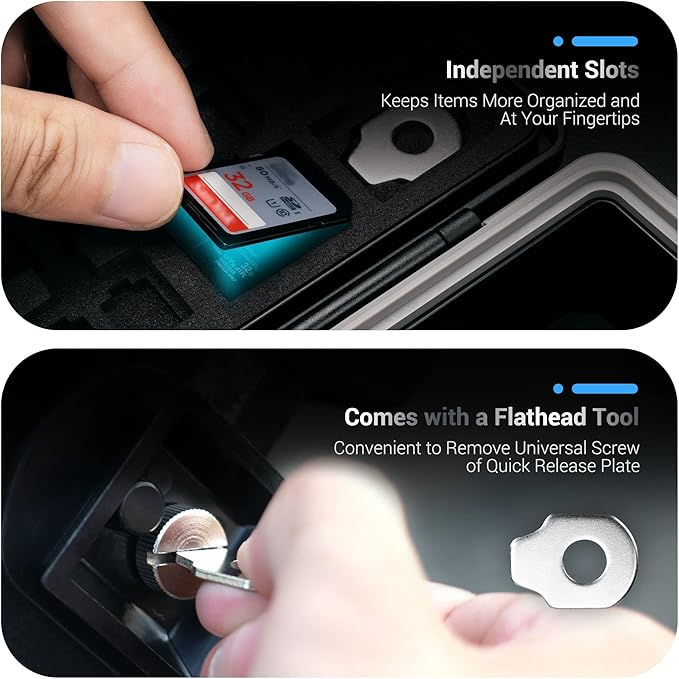 - 【Comes with a Flathead Tool & a Number Sticker & a Label Sticker】: Comes with a flathead tool well organized inside of the lid, convenient for photography users to remove the universal screw of quick release plate.and the one sheet of pre-print number stickers and one sheet of label stickers, easy to organize and retrieve items.