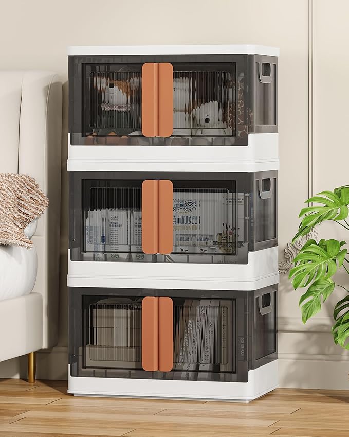 8.4Gal Collapsible Storage Bins with Lids & Wheels - 3 Pack Stackable with Doors, Heavy-Duty Plastic Containers for Home/Office, White