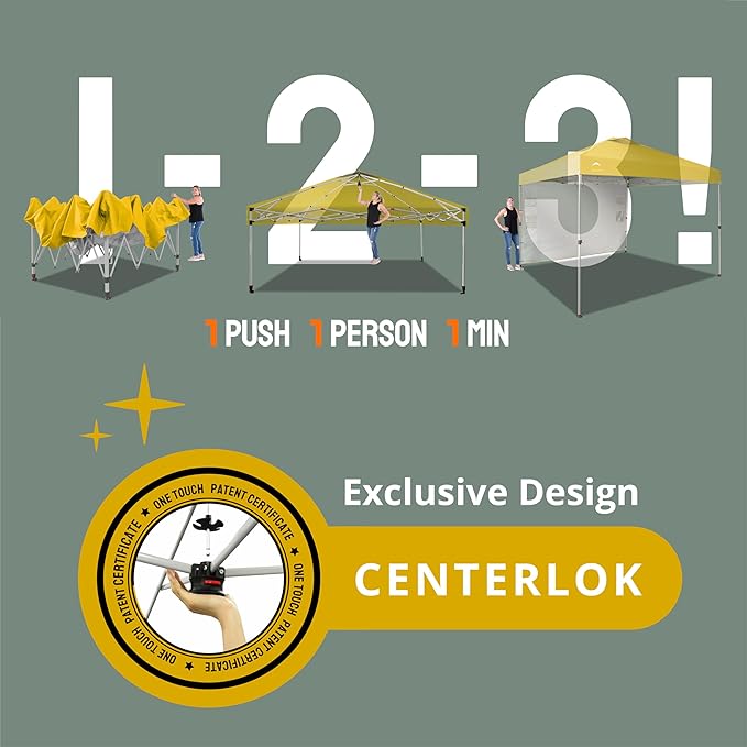 - ONE BUTTON EASY SET UP - Our 10x10 pop up canopy tent features patented one push center lock tech. With just a single push, the central hub locks the poles in place. Designed for the next generation, this outdoor canopy for patio can be set up by two people in seconds without any tools. Three adjustable height settings with soft, pinch-free buttons ensure convenience and safety, making it perfect for camping, beach outings, craft fairs, tailgating, farmer markets, outdoor BBQs, and more