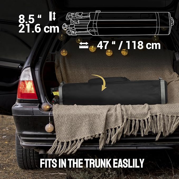 - SPACIOUS AND COMPACT - With a 10' x 10' canopy footprint, this tent provides 100 square feet of shade, accommodating up to 10 people comfortably. The interior height exceeds 9 feet, and the maximum clearance under the valance is over 6 feet. When packed, the dimensions are 45” x 8.5” x 8.5”, fitting perfectly in your vehicle’s trunk. The headroom is enhanced by the absence of overhead crossbars, offering more spaciousness compared to traditional designs, making it great for parties and events