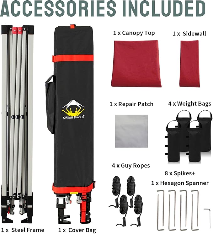 CROWN SHADES 10x10 Pop Up Canopy with 1 Side Wall - Beach Tent with One Push Setup - Outdoor Sun Shade for Events, Parties, Camping - Gazebo with STO-N-Go Cover Bag (Red)