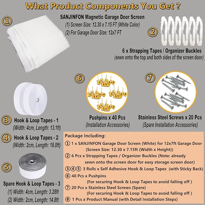 - [Easy Installation with Strong Magnets & Full Frame Magic Tape] - Installing our magnetic garage door privacy screen kit is a breeze! With 40 strong magnets and full-frame hook-and-loop strips (with heavy-duty adhesive), you can set this garage net screen up in minutes. For added durability, we include 20 stainless steel screws and 40 push pins to secure the screen firmly, preventing the adhesive from falling off. Perfect for DIY enthusiasts and anyone looking for a quick, hassle-free solution!