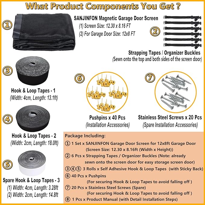 - [Easy Installation with Strong Magnets & Full Frame Magic Tape] - Installing our magnetic garage door privacy screen kit is a breeze! With 40 strong magnets and full-frame hook-and-loop strips (with heavy-duty adhesive), you can set this garage net screen up in minutes. For added durability, we include 20 stainless steel screws and 40 push pins to secure the screen firmly, preventing the adhesive from falling off. Perfect for DIY enthusiasts and anyone looking for a quick, hassle-free solution!