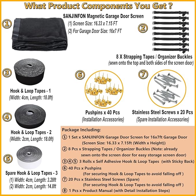 - [Easy Installation with Strong Magnets & Full Frame Magic Tape] - Installing our magnetic garage door privacy screen kit is a breeze! With 40 strong magnets and full-frame hook-and-loop strips (with heavy-duty adhesive), you can set this garage net screen up in minutes. For added durability, we include 20 stainless steel screws and 40 push pins to secure the screen firmly, preventing the adhesive from falling off. Perfect for DIY enthusiasts and anyone looking for a quick, hassle-free solution!