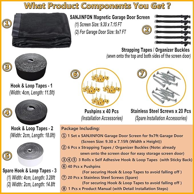 - [Complete Kit with Extra Accessories for Long-Lasting Performance] - We've got you covered with everything you need! Our garage gate screen door kit includes 20 stainless steel screws, 40 push pins, 2 sets of repair stickers to ensure your garage door screen stay firmly attached. These accessories solve the common problem of adhesive strips falling off, extending the screen's lifespan, and can repair accidentally scratched hole. Buy now and enjoy a bug-free, well-ventilated space all year round!