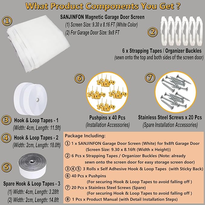 - [Complete Kit with Extra Accessories for Long-Lasting Performance] - We've got you covered with everything you need! Our garage gate screen door kit includes 20 stainless steel screws, 40 push pins, 2 sets of repair stickers to ensure your garage door screen stay firmly attached. These accessories solve the common problem of adhesive strips falling off, extending the screen's lifespan, and can repair accidentally scratched hole. Buy now and enjoy a bug-free, well-ventilated space all year round!