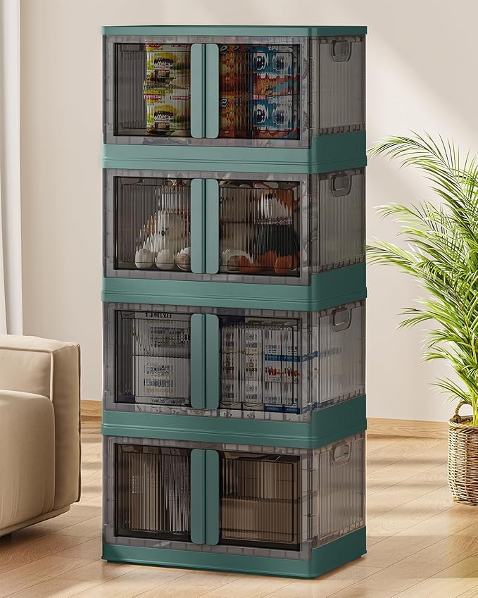 19Gal Collapsible Storage Bins with Lids & Wheels - 4 Pack Stackable with Doors, Heavy-Duty Plastic Containers for Home/Office, Green