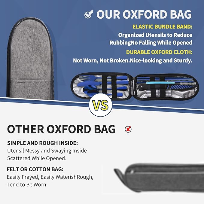 - The 10-Piece Travel Camping Cutlery Set:an zipper-case with a set of eating basis of a dinner fork, a dinner knife, a dinner spoon a tea spoon and a special included sheathed steak knife, two mini spice jars ,chopsticks, cleaning brush, and straight straw with silicone tips. The elastic bundle bands inside help to organize utensils stay good in the bag and avoid messy and falling while zipper opened.travel utensils with case