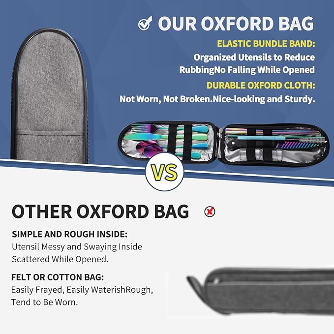 - The 10-piece portable silverware set includes: an zipper-case with a set of eating basis of a dinner fork, a dinner knife, a dinner spoon a tea spoon and a special included sheathed steak knife, two mini spice jars ,chopsticks, cleaning brush, and straight straw with silicone tips. The elastic bundle bands inside help to organize utensils stay good in the bag and avoid messy and falling while zipper opened.